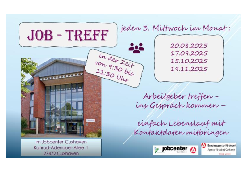 Termine im Jobcenter Cuxhaven, Konrad-Adenauer-Allee 1, 27472 Cuxhaven im Jahr 2025: